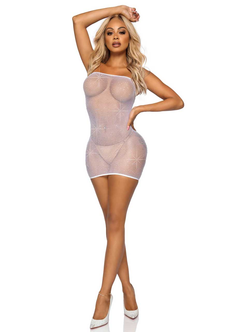 Weißes Netz-Minikleid / Schlauchkleid. Mit funkelnden Strasssteinen besetzt. Das Kleid ist variabel tragbar. Zum Beispiel auch als Rock. Markenqualität von Leg Avenue.